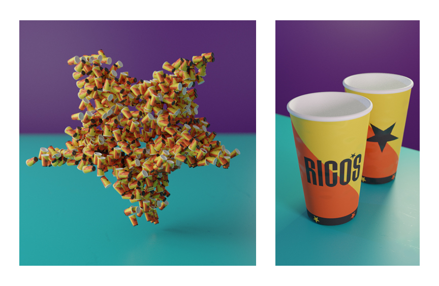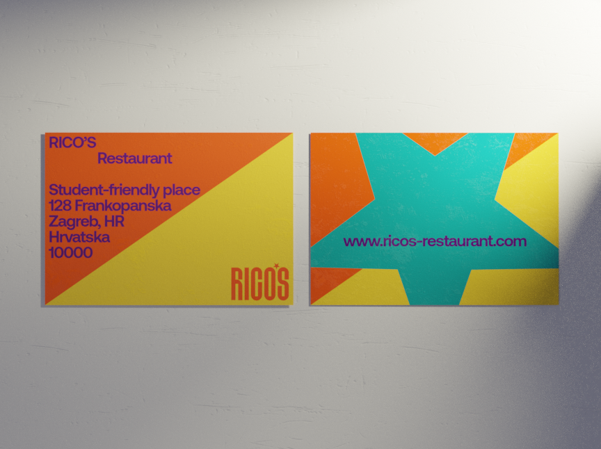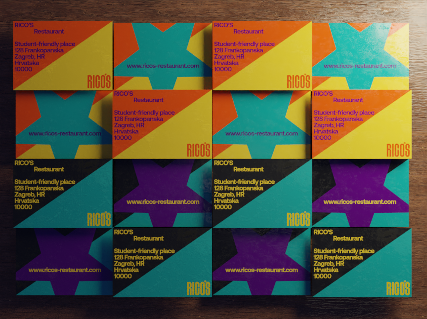 Prilikom izrade rješenja za RICO'S koristio sam Adobe Effects za izradu animacija, Blender za izradu rendera te JavaScript za generiranje grafika. Kada u planu imam izvesti jednu ili dvije grafike tada to radim u Illustratoru, no kada želim izvesti veliku količinu grafika (kao što je slučaj u ovome radu) tada mi je isplativije napraviti to putem programiranja i pustiti programskome kodu da u svega nekoliko sekundi izgenerira 10, 50 ili 100 grafika.